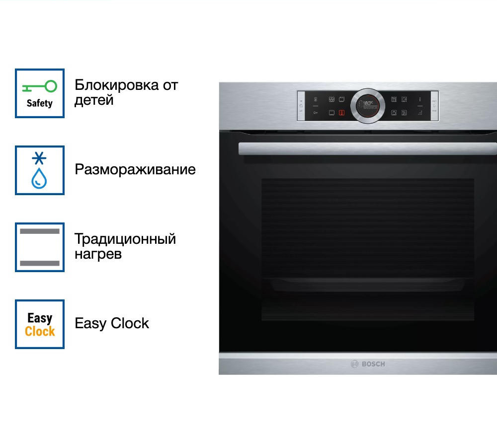 Духовой шкаф Bosch HBG655BS1M обладает интерактивным TFT-дисплеем с сенсорной панелью управления и переключателем ControlRing, что значительно облегчает эксплуатацию прибора. Автоматические программы AutoPilot помогут в приготовлении разнообразных блюд. Просто выбираете нужную программу и ждете результат. Дверца духового шкафа SoftMove обладает специальным амортизатором, что способствует ее плавному и тихому закрыванию.