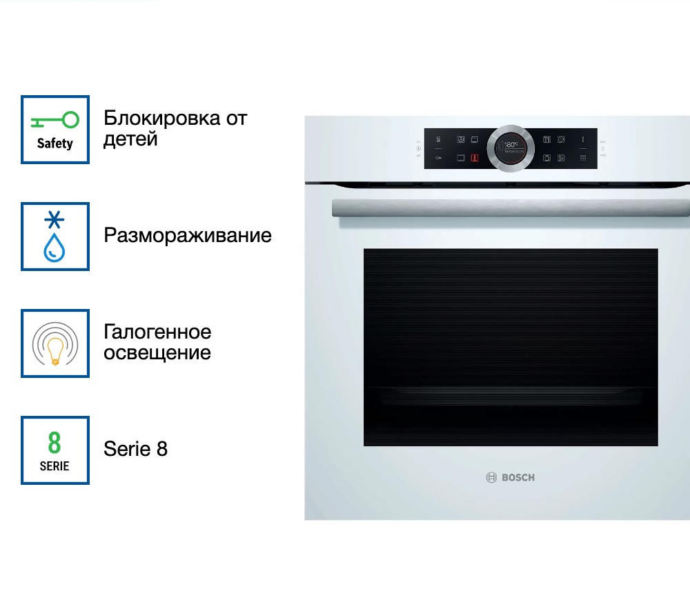 Духовой шкаф Bosch HBG675BW1 — это электрическая независимая модель из линейки Serie | 8. Ее внутренний объем составляет 71 литр, благодаря чему есть возможность запекать большие блюда. Она оформлена в белом цвете, благодаря чему отлично впишется в любой современный кухонный интерьер — например, в стиле хай-тек. Управление осуществляется посредством использования сенсорных кнопок и Control Ring.