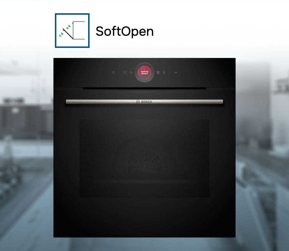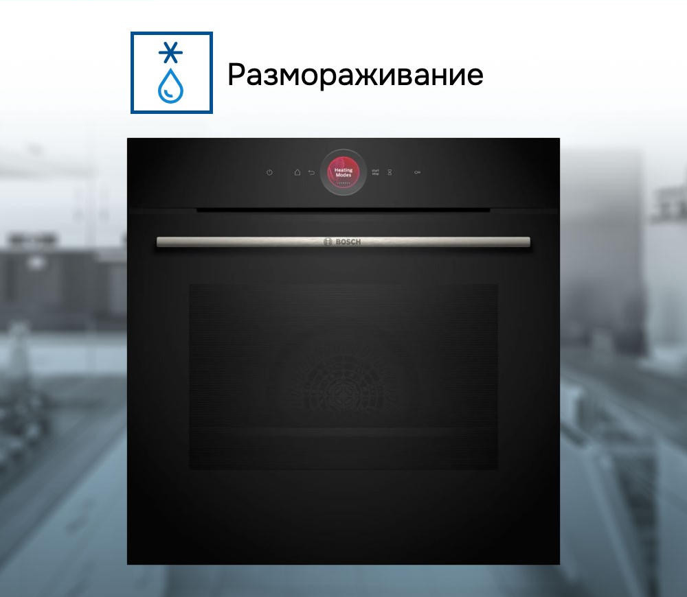 Духовой шкаф оснащен функцией Home Connect, которая позволяет управлять им дистанционно с помощью смартфона или планшета. Всего доступно 14 режимов нагрева, включая 3D-горячий воздух, верхний/нижний жар, большой гриль, режим для пиццы и другие. Диапазон температур варьируется от 30 до 300 градусов, что позволяет готовить самые разные блюда. Внутренний объем духового шкафа составляет 71 литр, что позволяет готовить большие порции еды для всей семьи. Внутреннее освещение на основе галогеновых ламп обеспечивает хорошую видимость в процессе приготовления пищи. Дверца шкафа откидная, с амортизатором SoftOpen для мягкого и безопасного открытия. Очистка духового шкафа производится с помощью системы EcoClean. Это специальные панели, расположенные на задней стенке, которые абсорбируют и разрушают жир и остатки пищи при повышенной температуре. Благодаря этому, вам не придется тратить много времени и усилий на очистку духового шкафа.