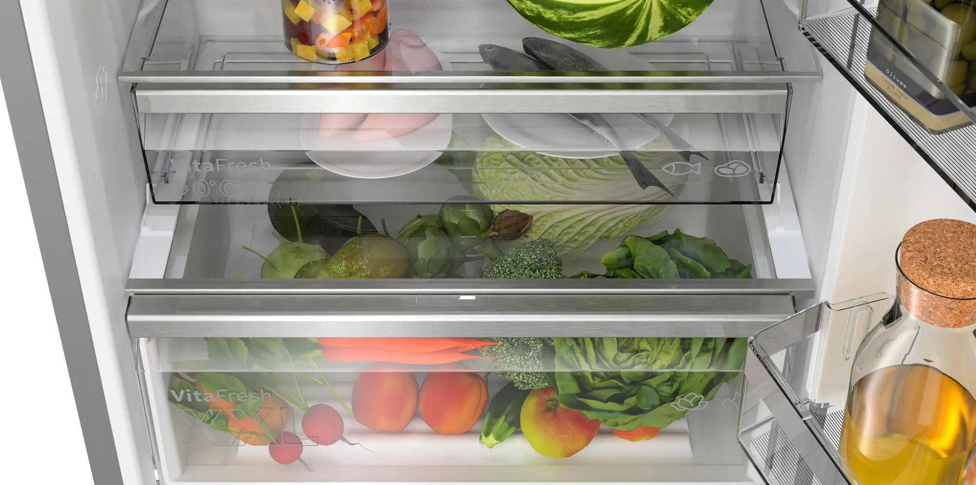 Двухкамерный холодильник Bosch KGN49AIBT — это превосходный выбор для тех, кто ценит качество, надежность и функциональность. Произведенный в Евросоюзе, он обеспечивает высокий уровень производительности и долговечность, подтвержденную гарантией на 12 месяцев. Стильный и современный дизайн холодильника выполнен в цвете нержавеющей стали, что делает его идеальным дополнением к любому интерьеру. Особенностью является обработка против отпечатков пальцев, благодаря которой поверхность всегда остается чистой и аккуратной. Управление холодильником осуществляется при помощи сенсорных элементов и электронного дисплея, что обеспечивает удобство и простоту использования. Система охлаждения No Frost и автоматическое размораживание обеспечивают оптимальные условия для сохранения свежести продуктов. С общим полезным объемом в 440 литров, в том числе 311 литров в холодильной камере и 129 литров в морозильной, этот холодильник предоставляет достаточно места для хранения большого количества продуктов. Внутри холодильника есть 5 полок, из которых 3 регулируемые и 2 фиксированные, а также специальная полка для бутылок и 4 полки на дверце. Все полки изготовлены из высокопрочного стекла, что обеспечивает их долговечность и надежность. Особое внимание заслуживает зона свежести VitaFresh, которая создает идеальные условия для хранения овощей, фруктов и мясных продуктов. В морозильной камере предусмотрены 3 ящика для замороженных продуктов и функция суперзамораживание SuperFreezing, позволяющая быстро заморозить большое количество продуктов.