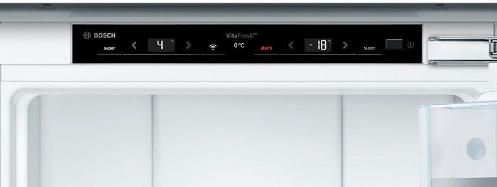 Двухкамерный холодильник Bosch KIF86HD20R — встраиваемая модель с зоной свежести с VitaFresh pro и системой охлаждения NoFrost. Морозильная камера расположена снизу, оснащена 3 ящиками для хранения продуктов, включая BigBox. Холодильное отделение укомплектовано 3 полками из закаленного стекла, 2 из которых можно переставлять по высоте, а также 2 зонами свежести VitaFreshPro и VitaFreshPro 0°C. Управление осуществляется непосредственно с помощью функции TouchControl и синхронизации с приложением Home Connect.
