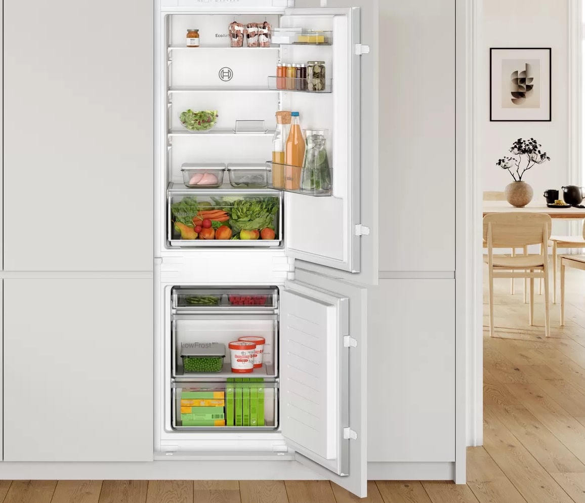 Двухкамерный холодильник Bosch KIV 865 SF0 - встраиваемая модель с ящиком для овощей и фруктов MultiBox. Благодаря циркуляции EcoAirflow поддерживается постоянная температура по всей холодильной камере. Система охлаждения LowFrost уменьшает обледенение морозильной камеры, излишняя влага отводится наружу через специальное отверстие.