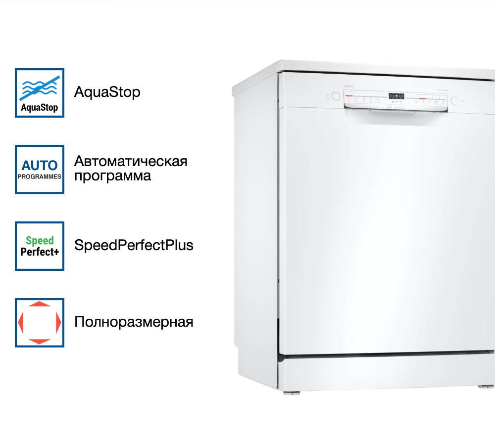 Посудомоечная машина Bosch SMS2ITW04E — отдельностоящий прибор, который выполнен в белом цвете с электронной панелью управления в виде кнопок и небольшого дисплея. Home Connect позволяет управлять устройством на расстоянии при помощи мобильного приложения. Функция ExtraDry поможет быстро высушить трудносохнущую посуду. Функция защиты стекла обеспечит бережную мойку стеклянной посуды и деликатных предметов.