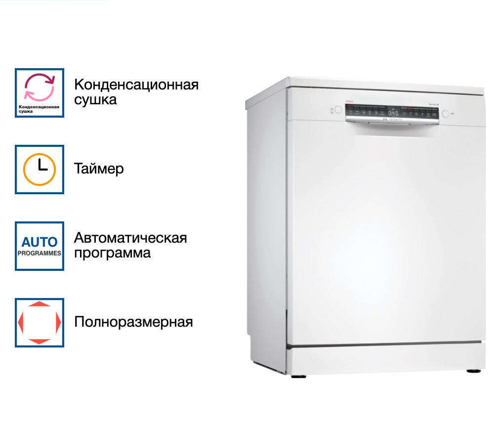 Посудомоечная машина Bosch SMS4IMW62Q — это отдельностоящая полноразмерная модель, которая сочетает в себе функциональность, стиль и надежность. Произведенная в Турции, эта машина обеспечивает гарантию на 12 месяцев, что подтверждает ее высокое качество и долговечность. Основной цвет машины — белый, что придает ей современный и элегантный вид, позволяя без труда вписаться в любой интерьер кухни. Машина оснащена инверторным двигателем EcoSilence Drive, который обеспечивает тихую и эффективную работу. Модель оборудована программами и температурными режимами, включая автоматическую, быструю, экономичную и интенсивную программы. Дополнительно предусмотрена. Посудомоечная машина Bosch SMS4IMW62Q оснащена нагревательным элементом проточного типа. Сенсор чистоты воды AquaSensor гарантирует эффективное и качественное мытье посуды. Панель управления машины закрытая, что обеспечивает удобство и безопасность использования. Дисплей и кнопки управления позволяют легко и быстро выбирать необходимые программы и настройки. Машина оснащена тремя корзинами для посуды и переставляемым по высоте верхним коробом с системой Rackmatic-3. Это обеспечивает гибкость и удобство при загрузке различной посуды. Система защиты от протечек обеспечивают безопасность эксплуатации машины. Блокировка от детей и встроенный предохранительный клапан являются дополнительными элементами безопасности. Материал внутреннего резервуара — нержавеющая сталь, что обеспечивает долговечность и устойчивость к коррозии. Машина имеет класс энергопотребления A++, что гарантирует экономичность и эффективность работы.