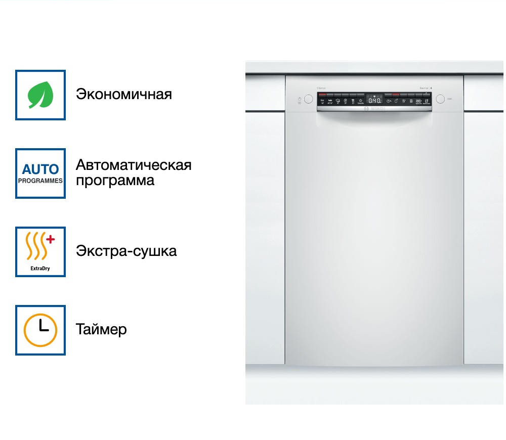 Встраиваемая посудомоечная машина Bosch SPU4HMW53S — это надежное и эффективное решение для современной кухни. Произведенная в Евросоюзе, эта модель предлагает высокое качество и долговечность, подтвержденные гарантией на 12 месяцев. Машина частично встраивается, что позволяет ей гармонично вписаться в любой интерьер, сохраняя при этом доступ к панели управления. Дизайн этой модели отличается простотой и функциональностью. Белый цвет панели управления придает ей современный и стильный вид. Управление осуществляется с помощью кнопок, а на дисплее отображается вся необходимая информация о текущем режиме работы.