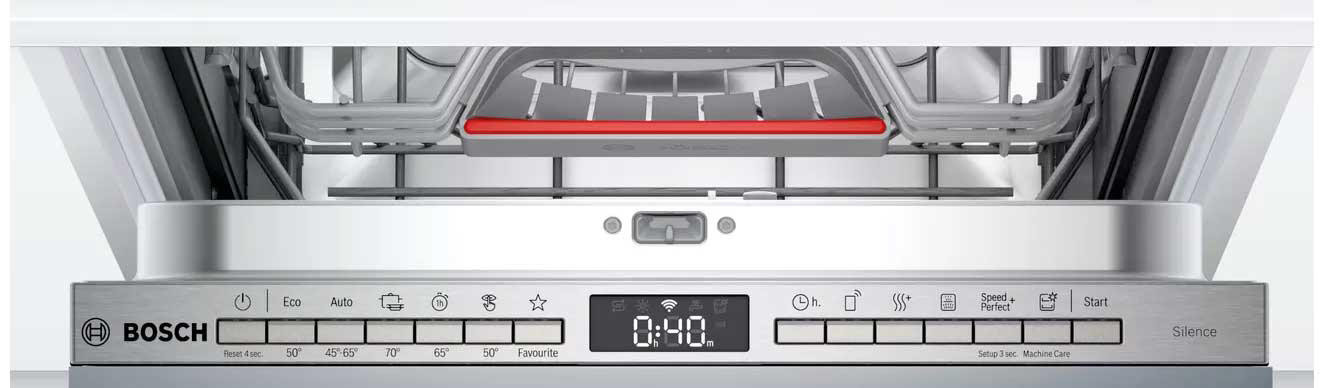 Посудомоечная машина Bosch SPV4HMX54E — узкая полновстраиваемая модель. Она способна вместить 10 комплектов посуды. Двойное верхнее коромысло создает безупречный результат мытья с первого раза. TimeLight — проецирование на пол времени до окончания программы, текущего этапа и общей статусной строки, заменяет скрытый на время работы дисплей прибора. Home Connect: настройка, диагностика, обновление программного обеспечения и запуск устройства прямо со смартфона.