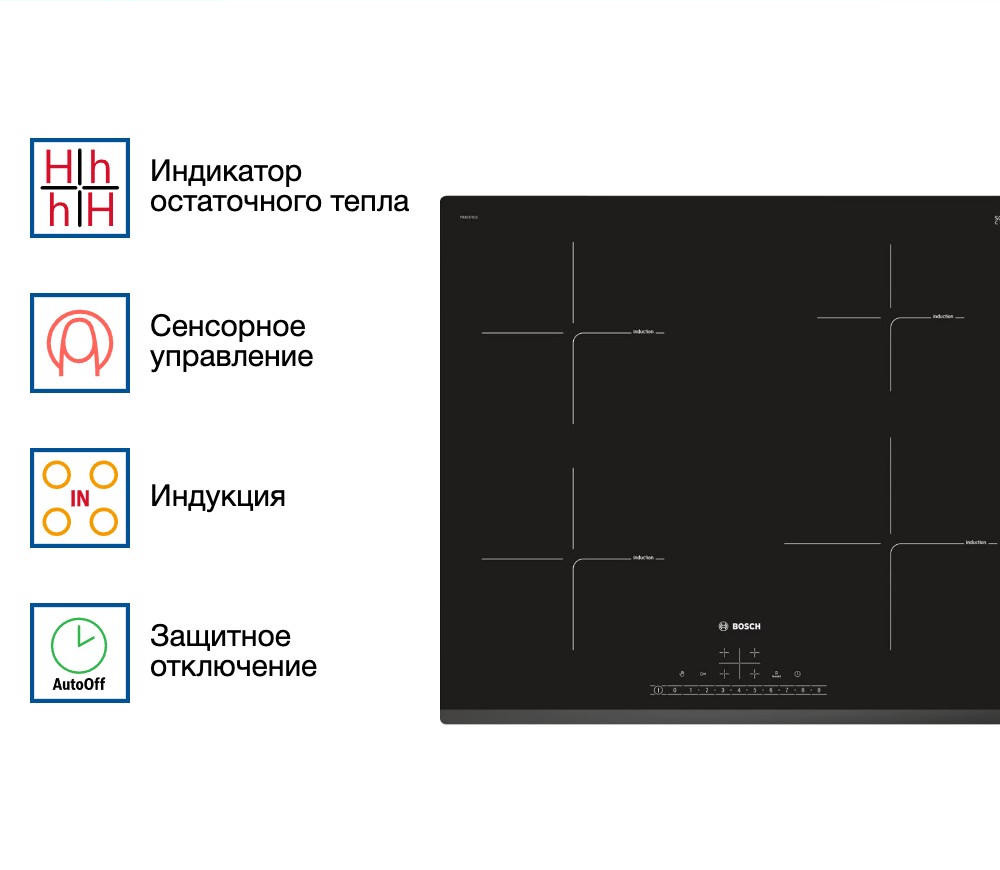 Привлекательный дизайн и эргономичность делают панель Бош PIE631FB1E отличным выбором для любого кухонного интерьера.
