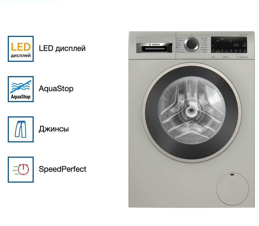Устройство имеет привлекательный современный дизайн с белым корпусом и удобным многофункциональным LED-дисплеем. Эргономичные кнопки управления и интуитивно понятные индикаторы делают процесс стирки максимально простым и комфортным. Модель относится к серии Serie 4 и представляет собой отдельностоящую машину с фронтальной загрузкой.