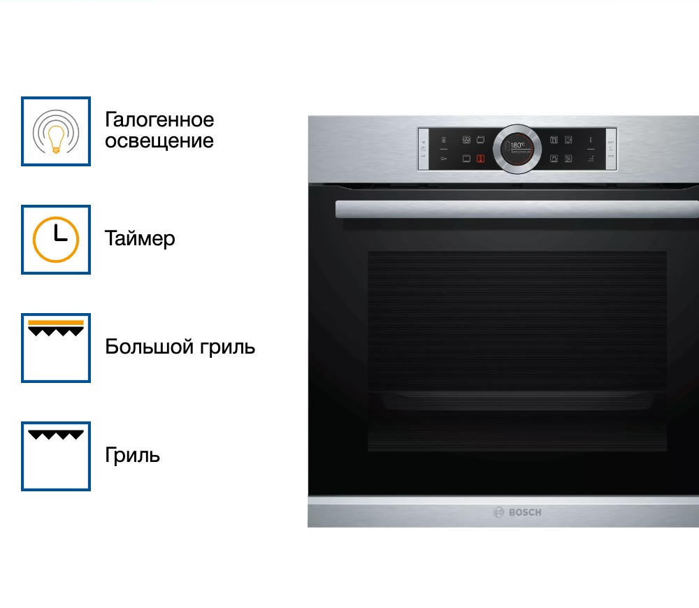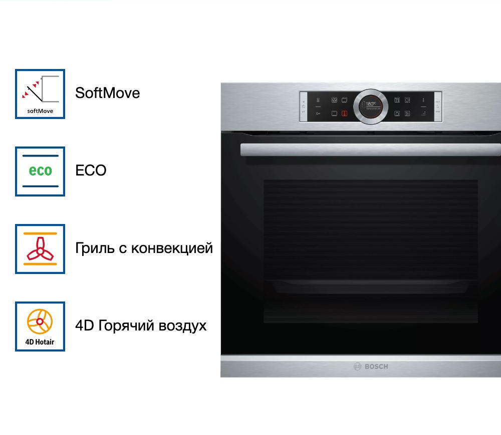 Духовой шкаф Bosch HBG655BS1M обладает интерактивным TFT-дисплеем с сенсорной панелью управления и переключателем ControlRing, что значительно облегчает эксплуатацию прибора. Автоматические программы AutoPilot помогут в приготовлении разнообразных блюд. Просто выбираете нужную программу и ждете результат. Дверца духового шкафа SoftMove обладает специальным амортизатором, что способствует ее плавному и тихому закрыванию.