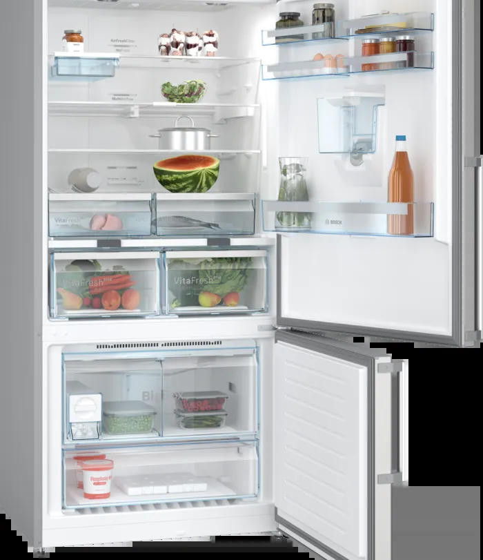Двухкамерный холодильник Bosch KGD86AI31U — это уникальное сочетание современного дизайна и продуманной функциональности. Этот модельный ряд выполнен в строгом стиле из нержавеющей стали, что придает ему особый шик и позволяет вписаться в любой интерьер. Благодаря специальной обработке, на поверхности не остаются отпечатки пальцев, что облегчает уход за холодильником и поддержание его в идеальном состоянии. Внутреннее пространство холодильника продумано до мелочей. Общий полезный объем составляет 682 литра, что позволяет вместить большое количество продуктов. Система охлаждения No Frost и автоматическое размораживание обеспечивают оптимальные условия для сохранения свежести продуктов. Электронное управление с сенсорными элементами и дисплеем делает использование холодильника максимально удобным и понятным. Система MultiAirflow обеспечивает равномерное распределение холода по всему объему, а функция суперохлаждения позволяет быстро охладить большое количество продуктов. В холодильной камере есть 3 полки, 2 из которых регулируемые, и одна фиксированная. Все полки изготовлены из высокопрочного стекла и обеспечивают надежное хранение продуктов. Кроме того, есть специальная полка для бутылок и 5 полок на дверце. Особенностью данной модели является наличие зоны свежести VitaFresh plus, которая обеспечивает оптимальные условия для хранения различных видов продуктов. В морозильной камере есть система размораживания и охлаждения, а также функция суперзамораживания SuperFreezing. Класс энергопотребления E (старое обозначение A++) говорит о высокой энергоэффективности устройства. Наличие защиты от детей, индикации открытой двери и сигнализации об ошибке обеспечивают безопасность использования.