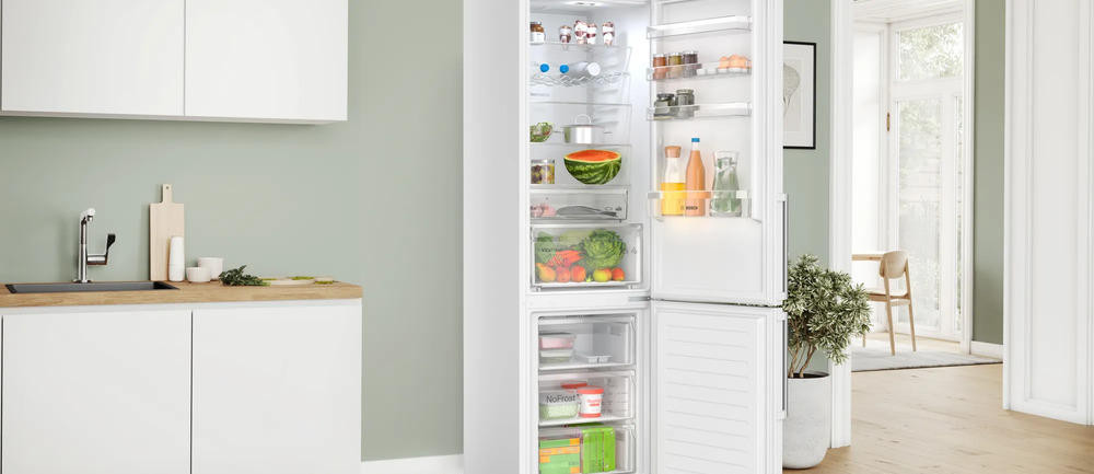 Двухкамерный холодильник Bosch KGN397WCT - это высокотехнологичное устройство, которое сочетает в себе функциональность, элегантный дизайн и надежность. Общий полезный объем 363 литра, что делает его идеальным выбором для больших семей. Электронное управление с сенсорными элементами и дисплеем делает использование холодильника удобным и простым. Также он оснащен функцией Home Connect, которая позволяет управлять устройством дистанционно с помощью смартфона или планшета. Система охлаждения No Frost обеспечивает равномерное распределение холода внутри холодильника, предотвращая образование льда и инея. Автоматическая система размораживания упрощает обслуживание и эксплуатацию. Система MultiAirflow обеспечивает оптимальное распределение температуры, сохраняя продукты свежими дольше.