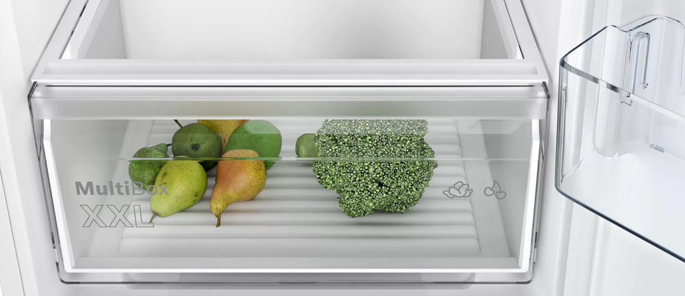 Встраиваемый двухкамерный холодильник Bosch KIN86NSF0 оснащен светодиодным освещением, не создает бликов, а также не требует постоянного замена. Контейнер Multi Box XXL позволяет вмести целый арбуз. Технология FreshSense сохраняет приятный климат для продуктов, не делая их слишком мягким или твёрдыми.