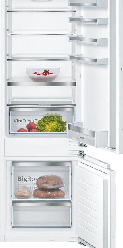 Встраиваемый двухкамерный холодильник Bosch KIS87ADD0 Этот встраиваемый агрегат сочетает лаконичный белый корпус и продуманную внутреннюю организацию, которая создана для тех, кто ценит порядок, экономичность и надежность. Серия Serie | 6 воплощает современный подход к хранению продуктов: общий полезный объем 270 л распределен так, чтобы холодильная камера занимала 208 л, а морозильная — 62 л, что обеспечивает комфортную вместимость для семьи. Инверторный компрессор и тип мотора инверторный гарантируют плавную работу и экономичное энергопотребление: годовой расход составляет 165 кВт·ч при мощности подключения 120 Вт, а уровень шума не превышает 35 дБ, благодаря чему прибор практически не мешает в повседневной жизни. Панель управления реализована электронно с удобными кнопками и информативным дисплеем, который позволяет точно задавать режимы работы. Холодильная камера оснащена системой статического охлаждения и ручным размораживанием, что способствует длительному сохранению качества продуктов при простоте обслуживания.
