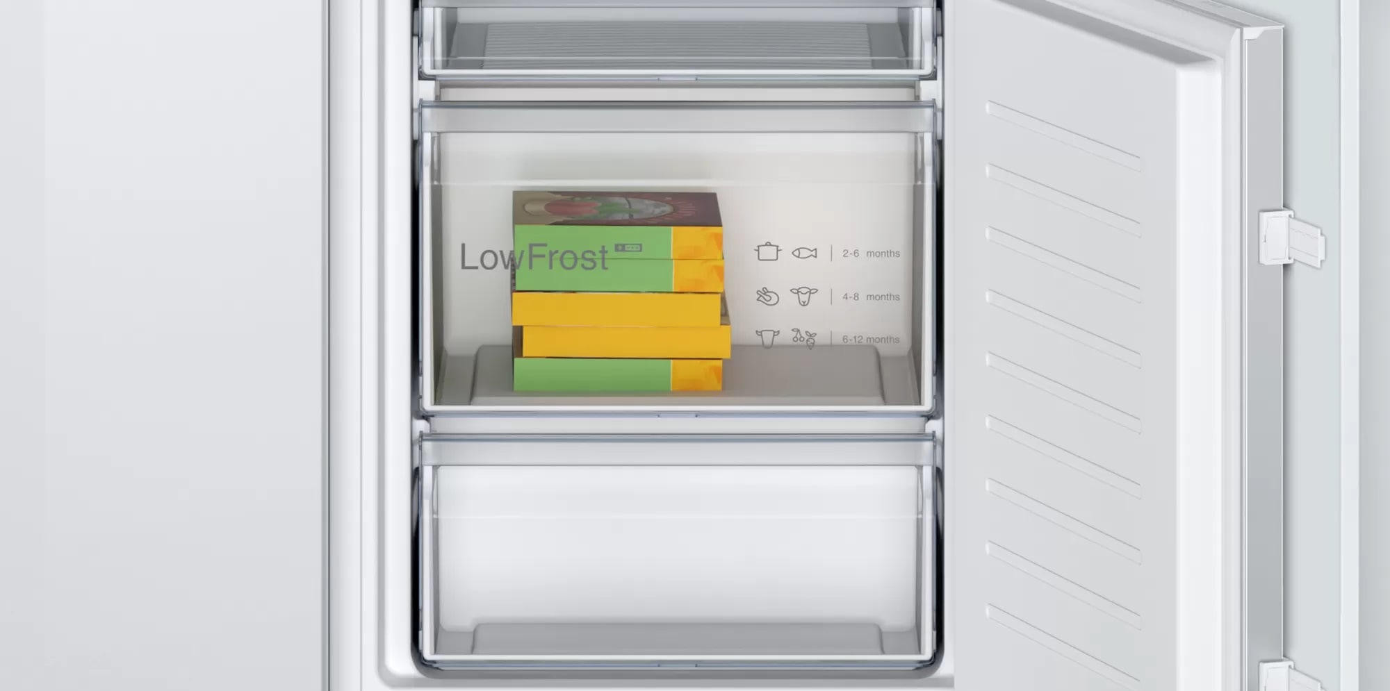Двухкамерный холодильник Bosch KIV 865 SF0 - встраиваемая модель с ящиком для овощей и фруктов MultiBox. Благодаря циркуляции EcoAirflow поддерживается постоянная температура по всей холодильной камере. Система охлаждения LowFrost уменьшает обледенение морозильной камеры, излишняя влага отводится наружу через специальное отверстие.