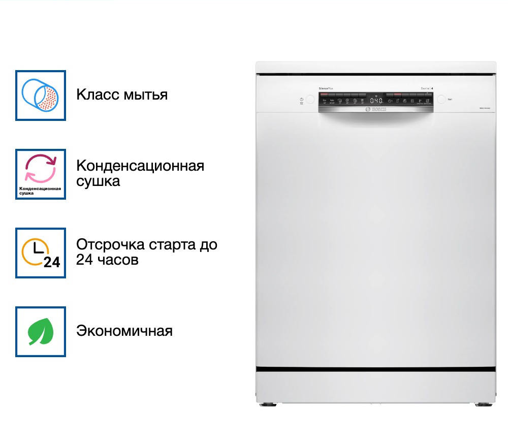 Посудомойка Bosch SMS4ECW26M — это та техника, что делает порядок на кухне почти незаметным. Её светлый, нейтральный фасад легко вписывается в любой интерьер — от строгого минимализма до уютной классики. Аккуратные пропорции и отдельностоящая конструкция позволяют поставить её без сложных врезок: просто подключили — и готово. Она не требует особого внимания, но при этом решает одну из самых рутинных задач без лишнего шума.