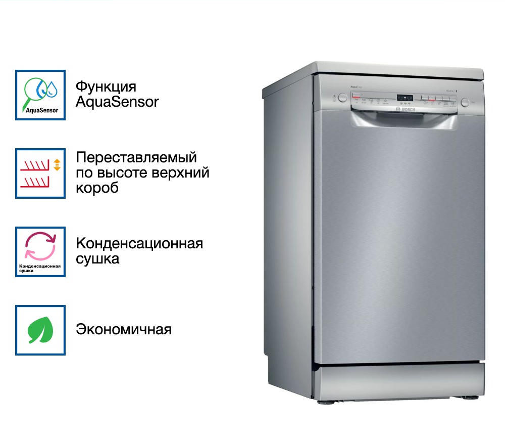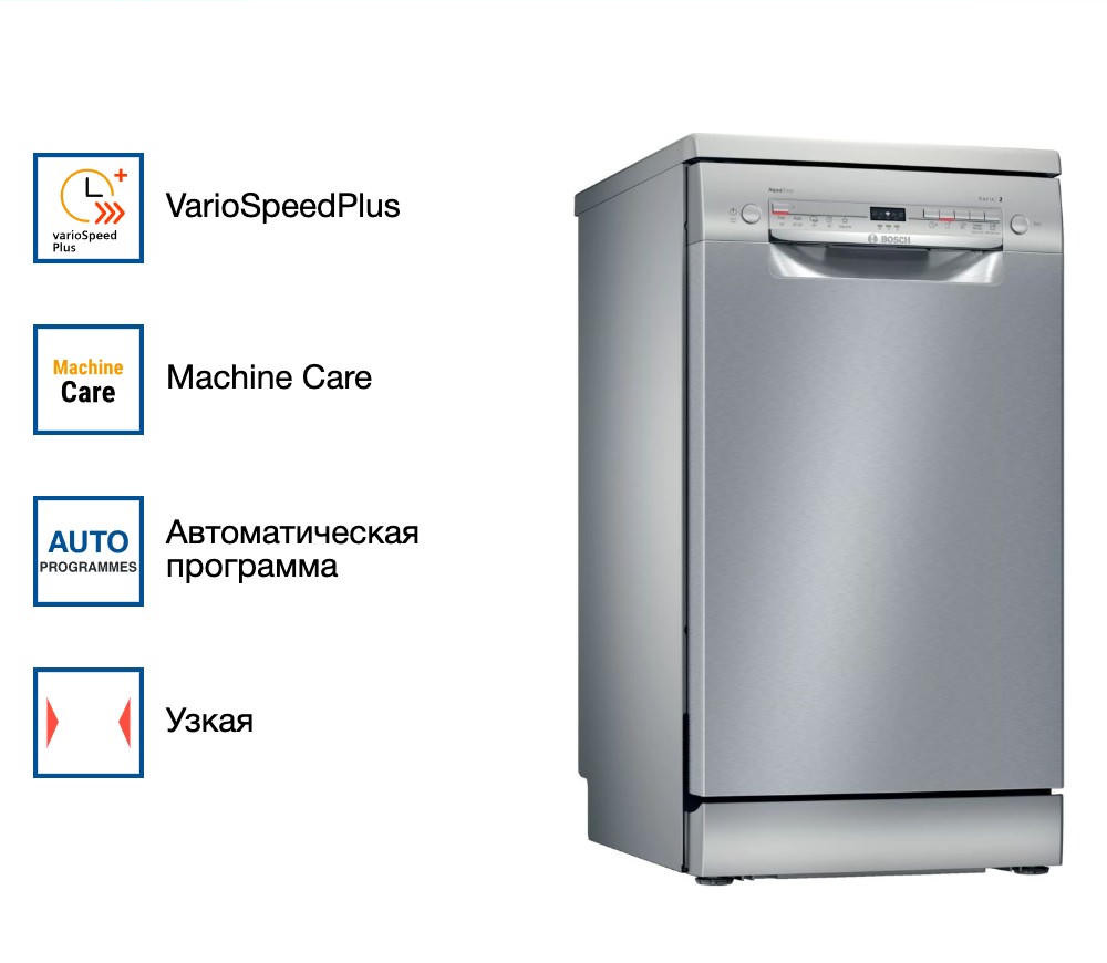 Посудомоечная машина BOSCH SPS2IKI02E выполнена в серебристом цветовом решении. Данный прибор вмещает в себя 9 комплектов посуды. Ширина данного устройства 45 см, что позволит вместить его на любую кухню. Дисплей облегчит эксплуатацию посудомойки.
