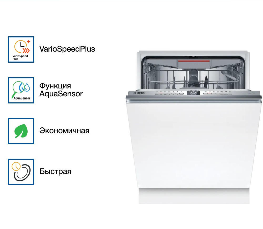 Встраиваемая посудомоечная машина Bosch SBH4ECX10E — это высококачественный и многофункциональный помощник на кухне. Произведенная в Евросоюзе, она отличается превосходным качеством сборки и использованием современных технологий. Дизайн машины выполнен в классическом стиле, что позволяет ей гармонично вписаться в интерьер любой кухни. Панель управления, выполненная из нержавеющей стали, не только придает модели элегантный вид, но и обеспечивает ее долговечность. Машина оснащена инверторным двигателем EcoSilence Drive, который обеспечивает тихую и эффективную работу. Благодаря этому, уровень шума составляет всего 42 дБ, что позволяет использовать машину даже ночью без беспокойства о том, что она помешает отдыху. Вместительность устройства составляет 14 комплектов посуды, что делает его идеальным выбором для больших семей. Машина предлагает шесть стандартных программ мытья и четыре температурных режима, позволяя выбрать наиболее подходящий режим для различных типов посуды и степени ее загрязнения. Особенностью модели является функция VarioSpeedPlus, которая позволяет ускорить процесс мытья до трех раз, сохраняя при этом отличное качество. Также стоит отметить наличие системы AquaStop, которая обеспечивает полную защиту от протечек. Модель оснащена функцией автооткрывания дверцы после окончания программы, что способствует более эффективной сушке посуды. Система Machine Care помогает поддерживать машину в чистоте и продлевает ее срок службы. Посудомоечная машина Bosch SBH4ECX10E оснащена функцией Home Connect, которая позволяет управлять устройством с помощью смартфона. Это очень удобно, так как позволяет запускать и контролировать процесс мытья даже на расстоянии.