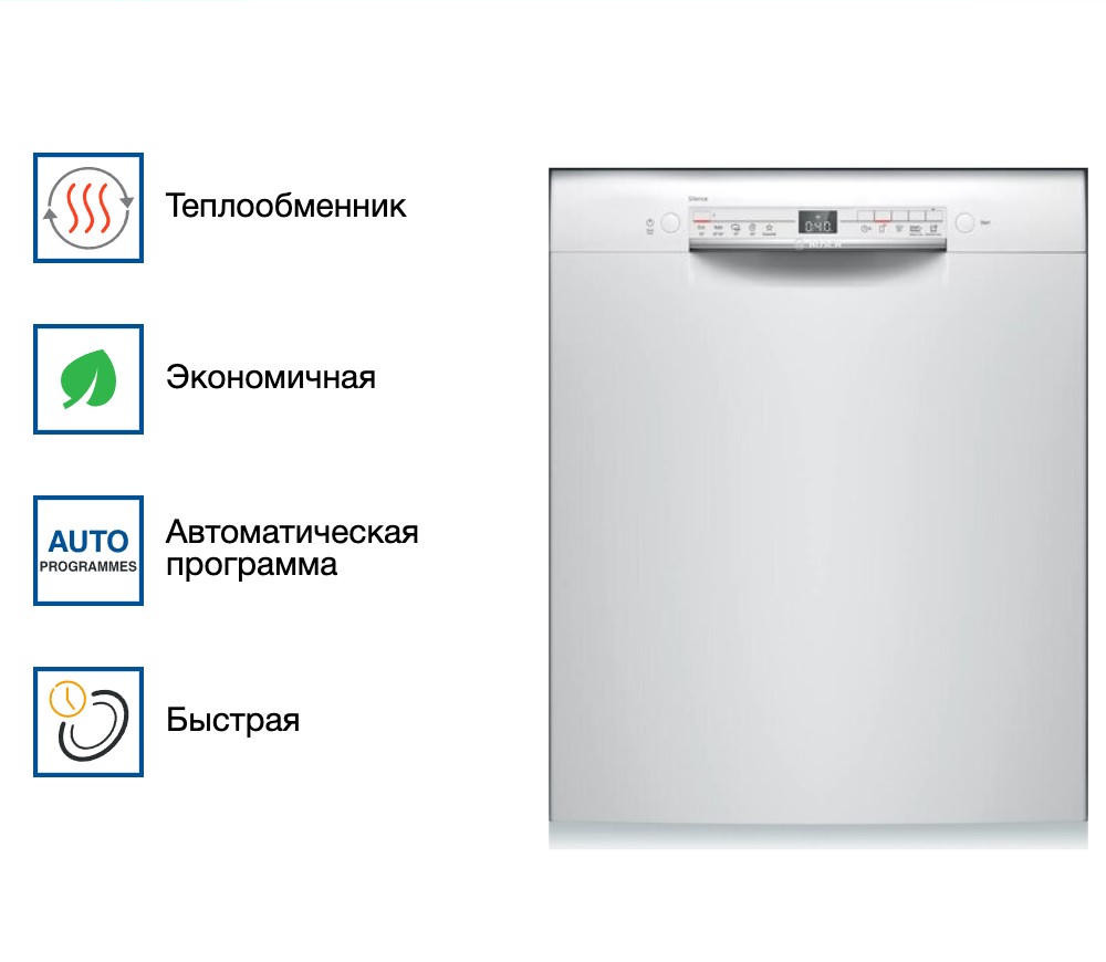 Посудомоечная машина Bosch SMU 2HVW20S — прибор с белой панелью управления. Устройство вмещает в себя 13 комплектов посуды. Таймер отсрочки представляет собой достаточно простое устройство, которое позволяет отложить начало выполнения программы на определенное время, что существенно сэкономит затраты на энергоресурсы.