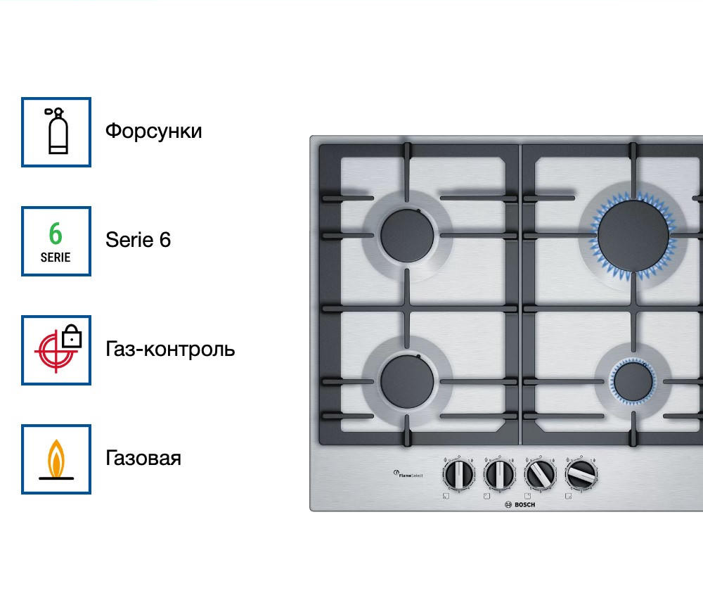 Варочная панель Bosch PCP6A5B90M выполнена из нержавеющей стали. Такой материал особенно устойчив к высоким температурам и моющим средствам. Он отличается долгим сроком эксплуатации. Открытый огонь не страшен ни Вам, ни вашей посуде — горелки надежно закрыты решетками. Чугунные решетки устойчивы к высоким температурам и долговечны. Они дополняют дизайн моделей, долго сохраняют свой внешний вид, безопасны при приготовлении, а также шероховатая поверхность не позволяет скользить посуде.