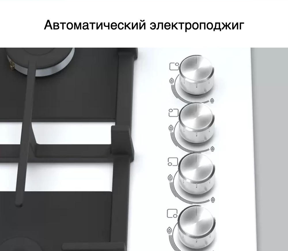 Данная модель обладает всем необходимым, чтобы пользователю было комфортно ей пользоваться. Удобные поворотные переключатели, расположенные в правой части прибора, позволят с легкостью им управлять. Автоматический электроподжиг значительно упростит эксплуатацию и заставит забыть о иных способах розжига горелок, а газ-контроль сбережет вас от нежелательной утечки посредством перекрытия газа при погашении пламени конфорки.