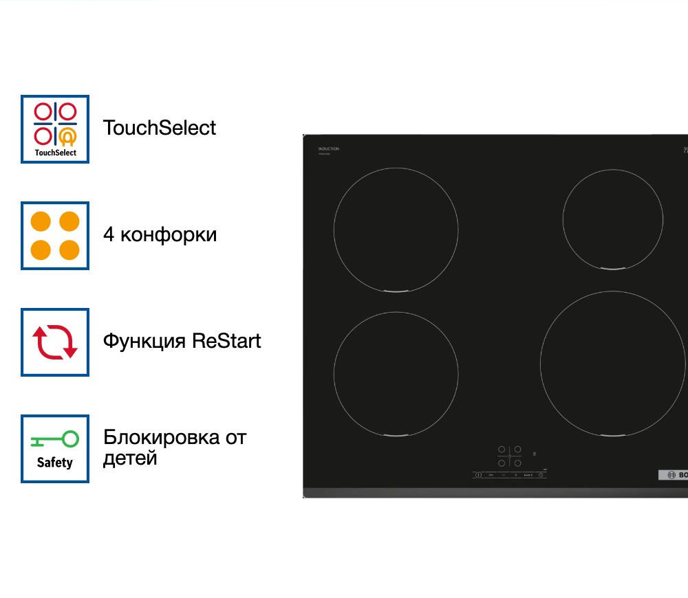 Варочная панель Bosch PIE 631BB5E оснащена таймером, который отключает выбранную конфорку по истечение времени. «Блокировка от детей» поможет от случайного нажатия. При внезапном отключении поможет функция памяти заданных настроек, при повторном включении все заданные параметры восстановятся.