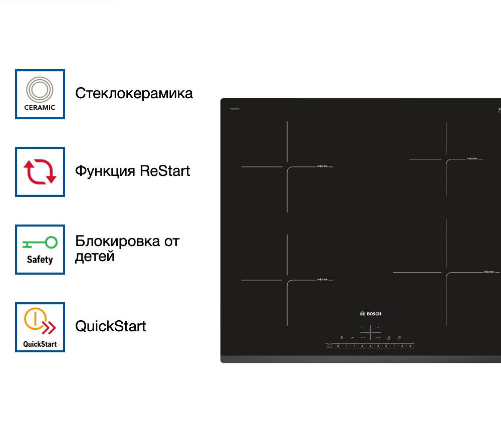 Различные дополнительные опции сделают эксплуатацию прибора удобной и простой. С помощью функции QuickStart расположение посуды на рабочей поверхности определяется сразу после включения. Вам не нужно тратить время на выбор конфорки, просто устанавливайте ступень мощности, и приготовление пищи уже начато.