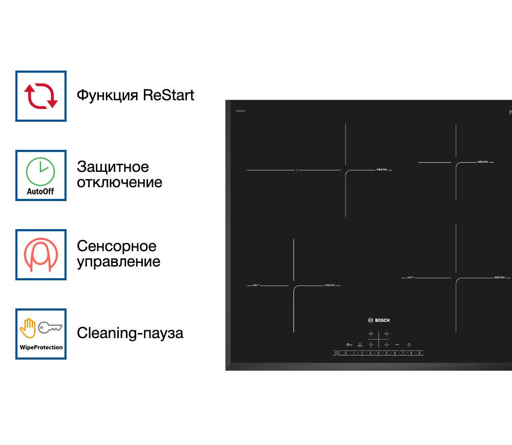 Варочная поверхность Bosch PIF651FC1E — это сочетание высоких технологий, элегантного дизайна и надежности. Произведенная в Евросоюзе, она обладает гарантией в 12 месяцев, что подтверждает ее высокое качество. Элегантная черная стеклокерамическая поверхность с скошенным краем не только выглядит стильно, но и обеспечивает удобство в использовании. Сенсорные элементы управления с системой DirectSelect позволяют легко и быстро выбрать необходимую мощность и время приготовления.