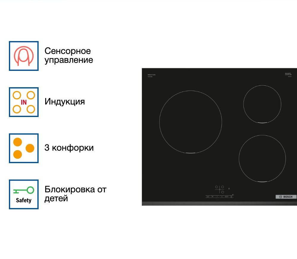 Индукционная варочная панель Bosch PUC631BB5E из серии Serie | 4 — это продуманное сочетание современного дизайна и интеллектуальной функциональности. Её чёрная стеклокерамическая поверхность с фасонными краями выглядит стильно и солидно, легко вписываясь в интерьеры любого типа — от урбанистического лофта до классической кухни. Сенсорное управление TouchSelect делает взаимодействие с техникой простым и логичным: все команды активируются лёгким прикосновением, без выступающих кнопок.