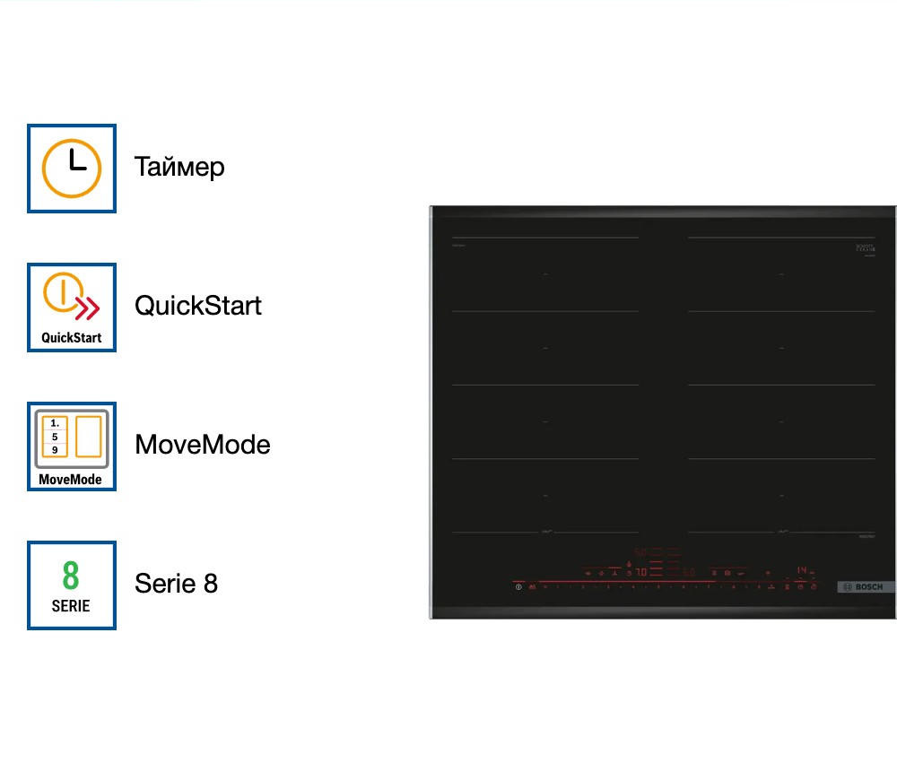 Дополнительные функции делают работу ещё комфортнее: QuickStart мгновенно активирует зону при касании посуды, ReStart сохраняет настройки при кратковременном отключении, а PowerBoost на 50 % увеличивает мощность для ускорения нагрева. Режим MoveMode позволяет «перемещать» нагрев вместе с посудой, а сенсор PerfectFry с пятью уровнями температуры обеспечивает идеальный контроль при жарке — от нежного тушения до хрустящей корочки.