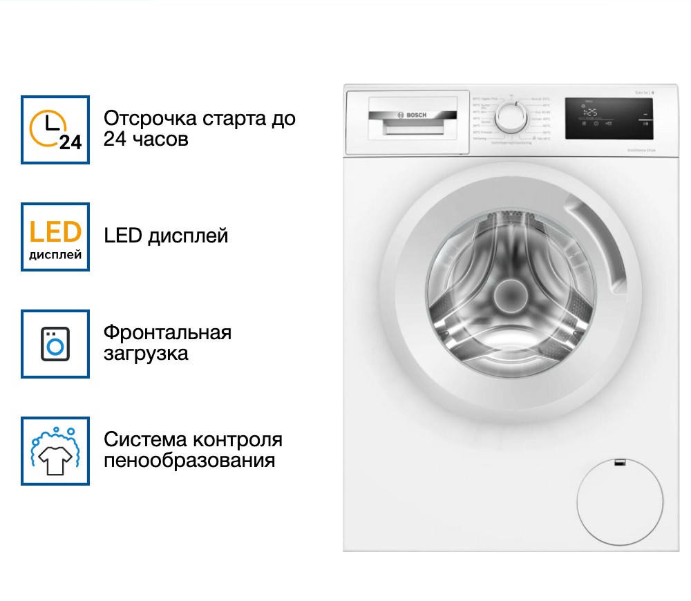 Стиральная машина Bosch WAN280L5SN — это отдельно стоящая модель, выполненная в белом цвете с черными элементами на панели управления. Она обеспечит качественную стирку всех типов одежды и белья. Оборудование имеет 15 автоматических программ стирки. В барабан машинки можно поместить до 7 кг вещей, а значит она удобна для семейного использования. При этом за один цикл стирки расходуется всего 55 л воды. Белье загружается через фронтальный люк, что очень удобно. При необходимости можно отложить стирку на более подходящее время с помощью функции отсрочки запуска. При окончании стирки прозвучит звуковой сигнал.