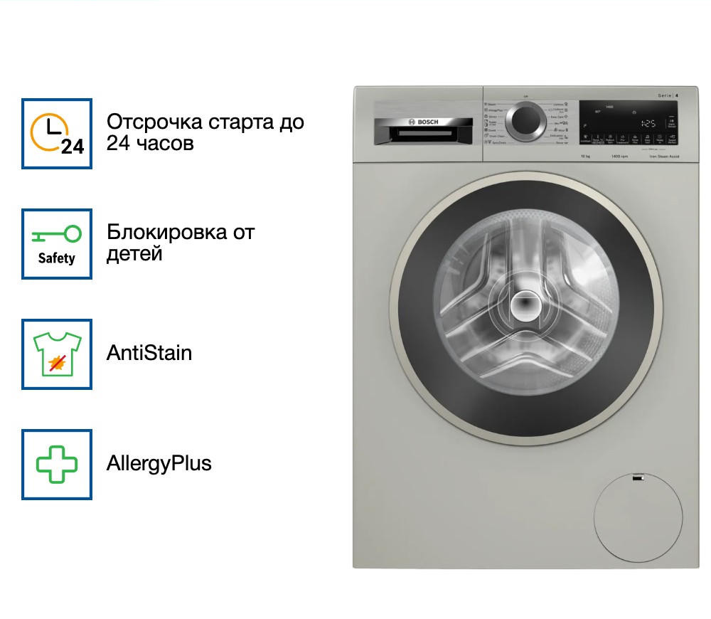 Устройство имеет привлекательный современный дизайн с белым корпусом и удобным многофункциональным LED-дисплеем. Эргономичные кнопки управления и интуитивно понятные индикаторы делают процесс стирки максимально простым и комфортным. Модель относится к серии Serie 4 и представляет собой отдельностоящую машину с фронтальной загрузкой.
