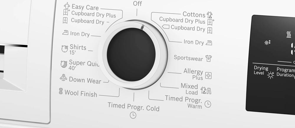 Управление осуществляется с помощью электронного блока с поворотным переключателем, что делает процесс настройки максимально простым и интуитивно понятным. LED-дисплей информирует пользователя о текущем состоянии программы, а наличие индикации заполнения ворсового фильтра и контейнера для конденсата помогает своевременно проводить обслуживание, предотвращая снижение эффективности сушки. Электромагнитный замок обеспечивает надежное закрытие дверцы, которая навешена справа, что удобно для большинства пользователей.